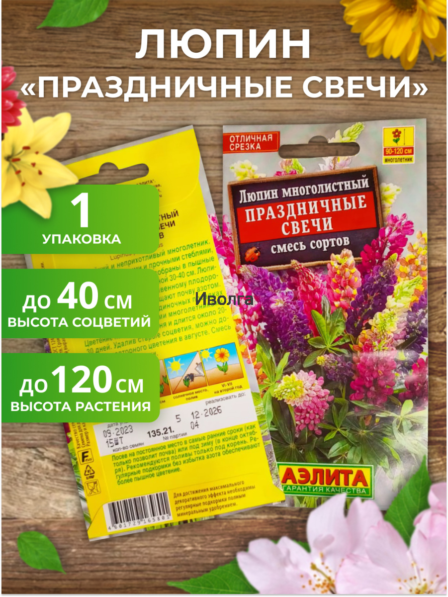 Люпин многолистный "Праздничные свечи" смесь сортов - зимостойкий и неприхотливый многолетник. Кусты с прямостоячими и прочными стеблями, высотой 90-120 см. Цветы собраны в кистевидные соцветия 30-40 см длиной. Люпины нетребовательны к почвенному плодородию – сами отлично обогащают почву азотом. Прекрасно выглядят в одиночных посадках и миксбордерах с другими многолетниками. Цветут в июне 20-30 дней, удалив отцветающие соцветия, можно получить повторное цветение в августе. Отличная срезка.