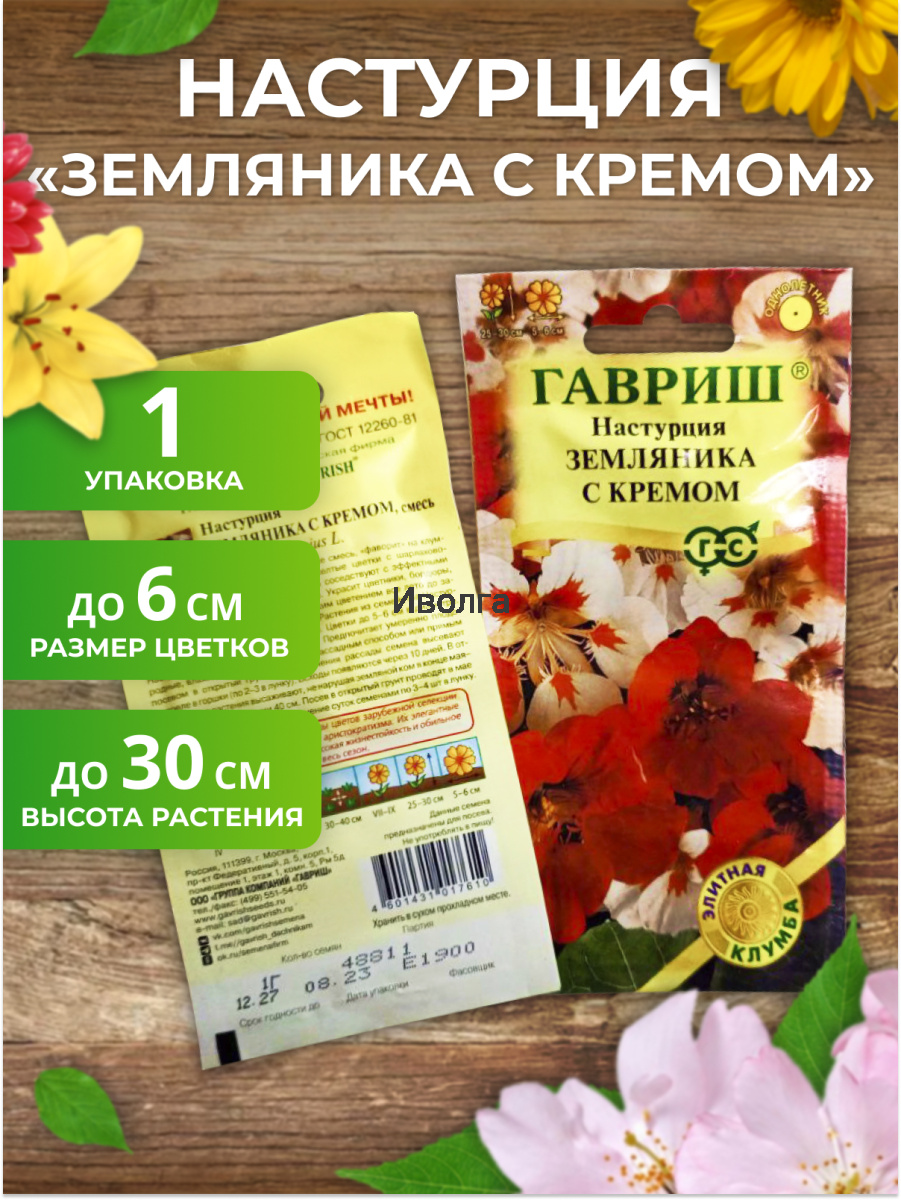 Настурция "Земляника с кремом" - удивительный по окраске сорт, «фаворит» на клумбе: махровые нежно-желтые лепестки цветков украшены очаровательными шарлахово-красными пятнышками. Украсит цветники, бордюры, вазоны и контейнеры. Будет радовать ярким цветением все лето до заморозков даже на самых бедных почвах. Растения из семейства Настурциевые, приземистые, до 30 см высотой. Цветки до 5-6 см в диаметре. Настурция теплолюбива и светолюбива.