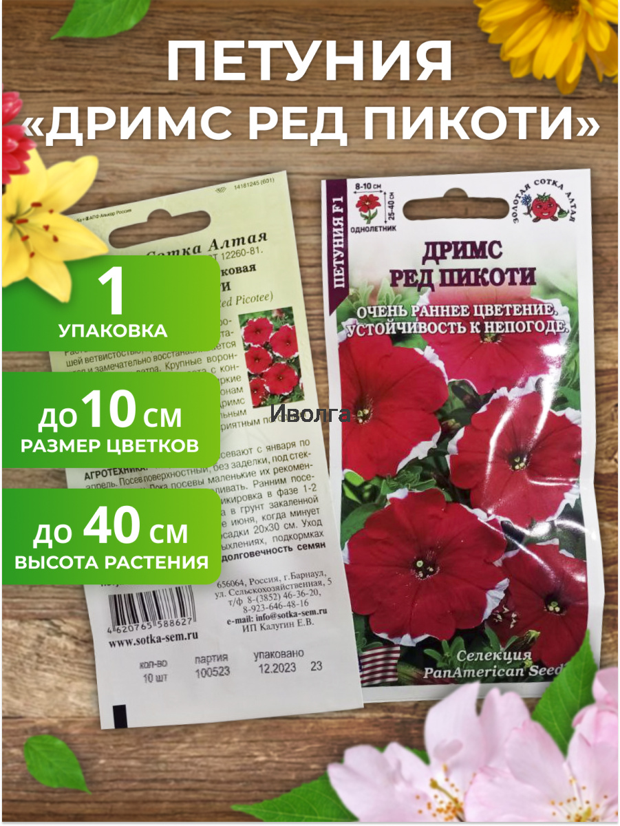 Петуния "Дримс Ред Пикоти F1"- шикарный гибрид с аккуратным белым контуром лепестков и крупными цветами! Растение мощное, высотой 20-25 см, устойчиво к заболеваниям. Цветы крупные красные с белой каймой, диаметром 8-10 см. Цветение обильное с июня до сильных осенних заморозков. Прекрасно подходит для клумб, рабаток.