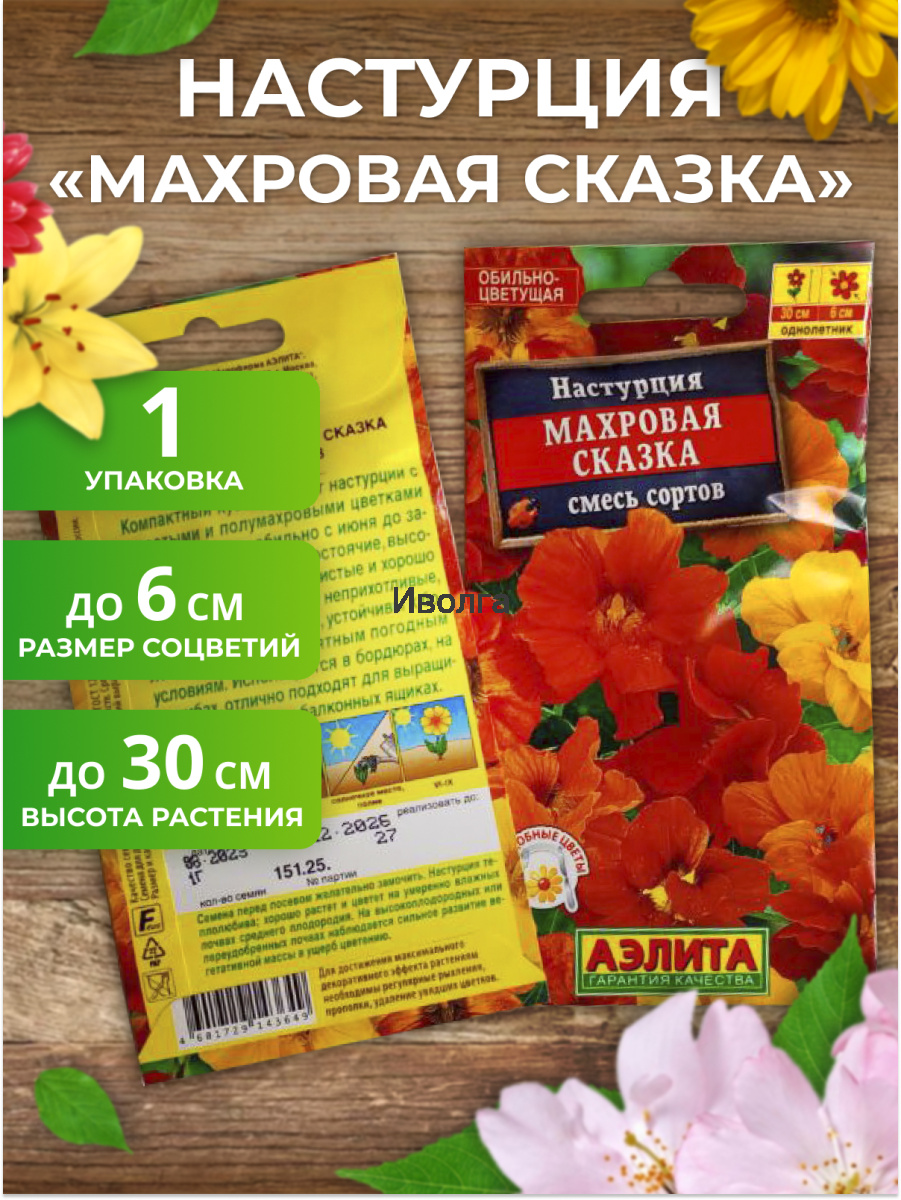Настурция "Махровая сказка" смесь сортов - компактный сорт настурции с крупными, махровыми цветками диаметром 4-6 см. Цветет обильно с июня до заморозков. Кустики прямостоячие, высотой до 30 см, сильноветвистые и хорошо облиственные, по мере разрастания становятся полустелящимися. Растения неприхотливые, тепло- и светолюбивые. Используются в бордюрах, на клумбах, для обсадки приствольных кругов деревьев, отлично подходят для выращивания в горшках и балконных ящиках.
